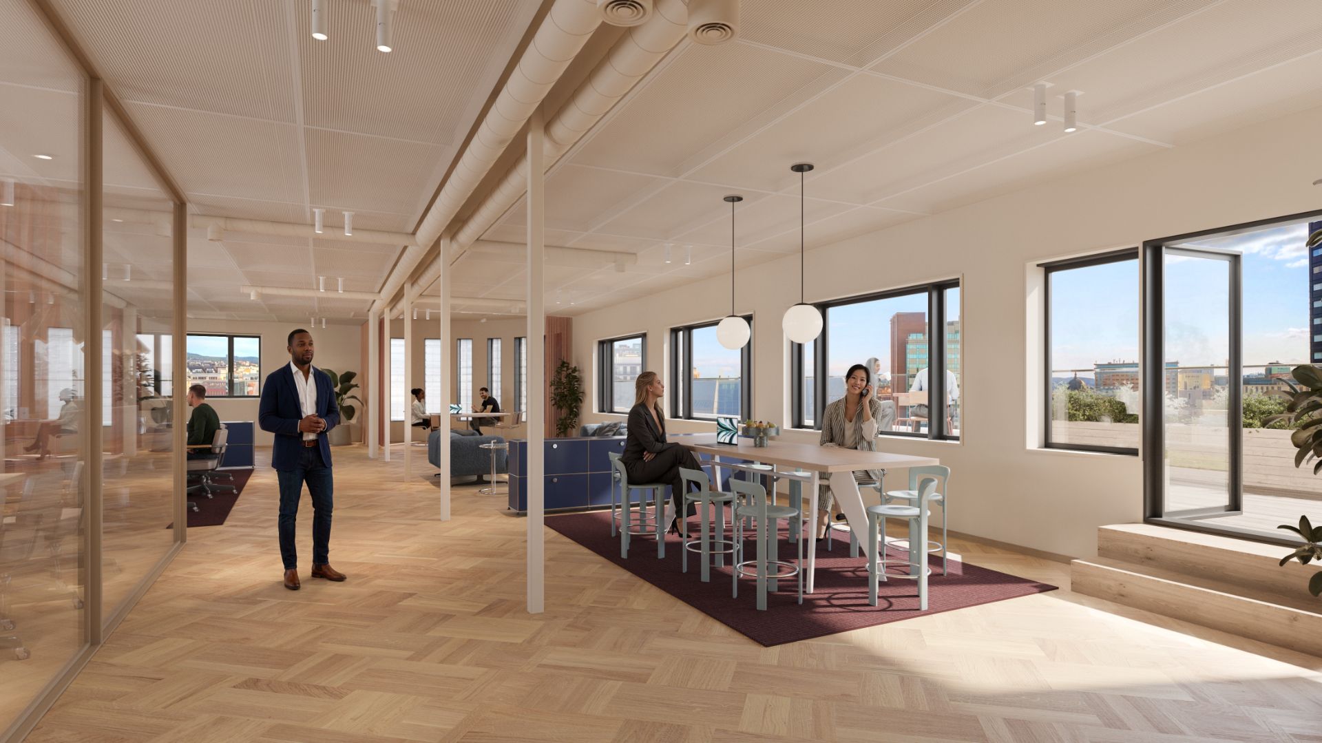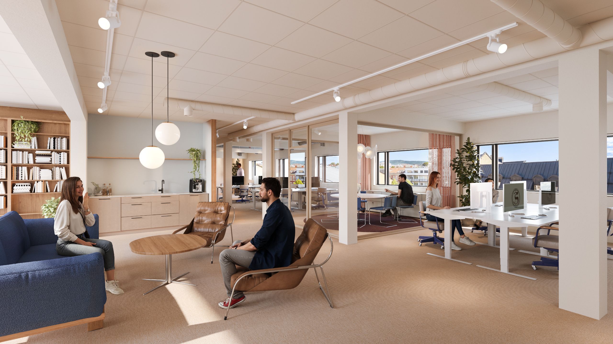 Rehabiliteringen har fokus på kombinasjonen av moderne interiørløsninger som samspiller med byggets opprinnelige karakter. Resultatet er arbeidsplasser med særpreg – et optimalt valg for virksomheter som ønsker mer enn standard kontorlokaler.